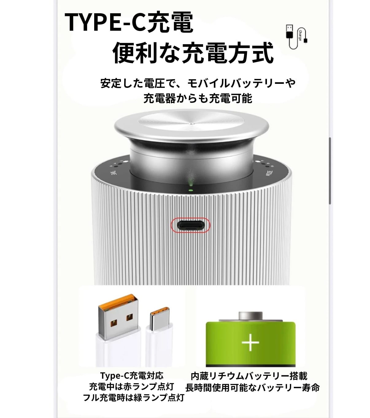 USB Type-Cで簡単充電、タイマー機能搭載
